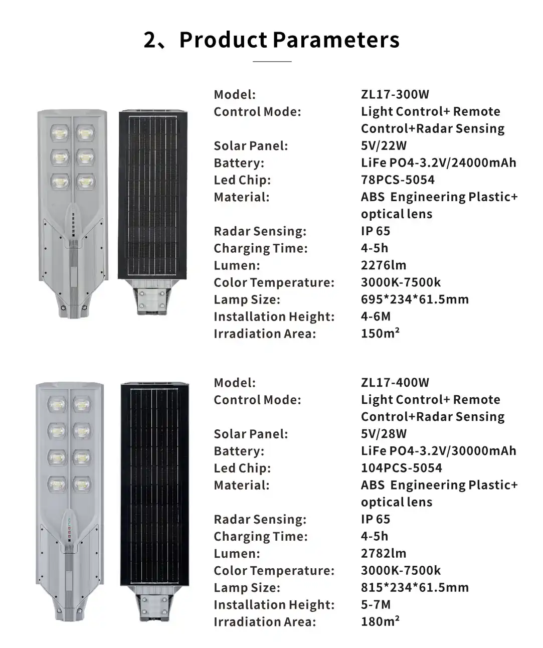 SolarTech দেশ ও বিদেশে সোলার স্ট্রিট লাইট প্রযুক্তিতে এগিয়ে চলেছে নির্ভরতার এক নতুন দিগন্তে। আমরা সরাসরি ইন্টারন্যাশনাল স্ট্যান্ডার্ড মানের পণ্য আমদানি করে সারা দেশে সরবরাহ করে থাকি।